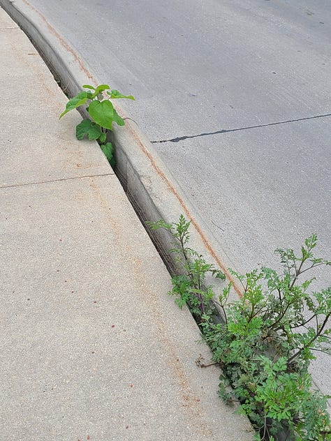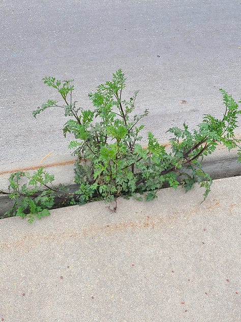 Call me a ground-gazer, (hey - I’m trying not to trip), but I cannot walk around in life without seeing weeds. These alien plants gone rogue (redundant, because plants are aliens) are everywhere - in the Target parking lot, the local college campus, in the flowerpots of the local pizza place, and creeping out of every concrete crevice not previously attended to by a person wielding poison spray. A low hum of a murmur goes off in my brain at the barest glimpse, saying “Weed! Weed! Get it! Kill it!” If my hands are free, I don’t care who is watching - I pluck it out to die.